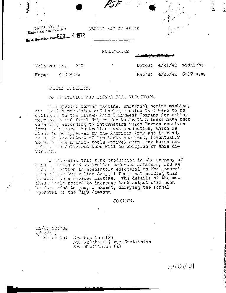 [a40d01.jpg] - Telegram No. 220-Canberra-->Stettinius and McCabe